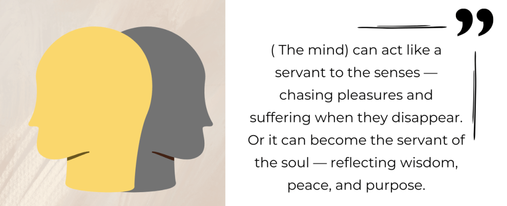 It is the seat of our thoughts, desires, memories, and the power to discriminate. It is a bridge between the soul and the sense organs. From the information it receives through the senses, it makes sense of the world around us. It can act like a servant to the senses — becoming happy when it finds the object of its chase, and suffering when those objects disappear. Or, it can turn inward and become the servant of the soul — reflecting wisdom, peace, and purpose.