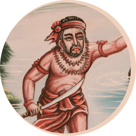 He built a hut on a cliff from where he could see travelers passing by the road below. Whenever he saw someone passing by, he would ambush and kill them. And cut a finger from their right hand. At first, he hung the fingers on a tree branch, but birds soon pecked them away. So he strung them together and wore them around his neck.