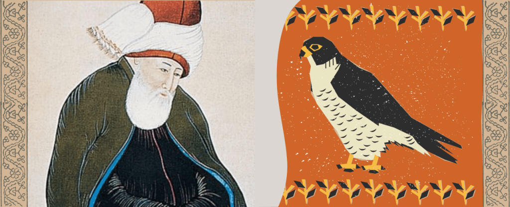 In the Masnavi, Rumi tells of a king’s falcon that wandered away from the palace and landed at the doorstep of an old woman.