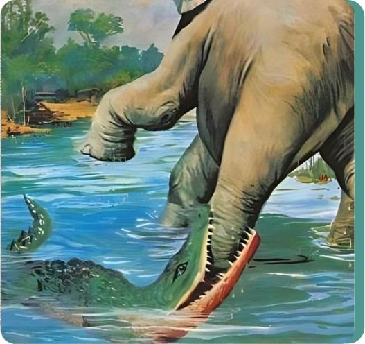 The herd panics. The elephants try to help, but the crocodile is strong. Being a land animal, Gajendra is at a disadvantage in the water.