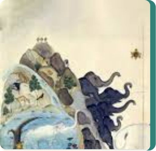 The story unfolds in the mountains of Trikuta, described as a lush paradise of clear lakes, flowing rivers, orchards, and dense forests. A mighty elephant named Gajendra lives here with his herd.